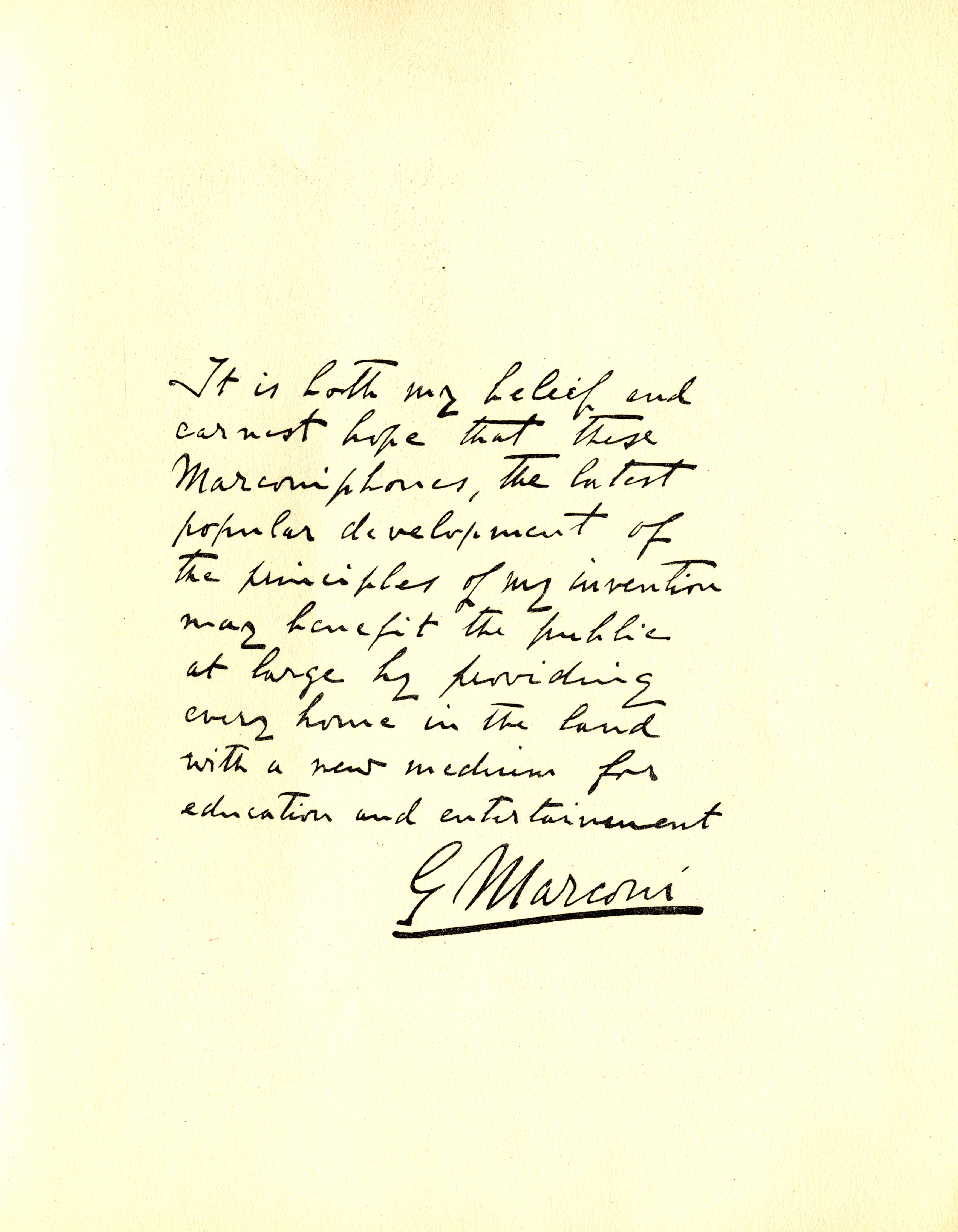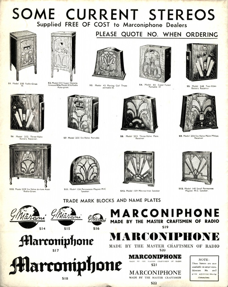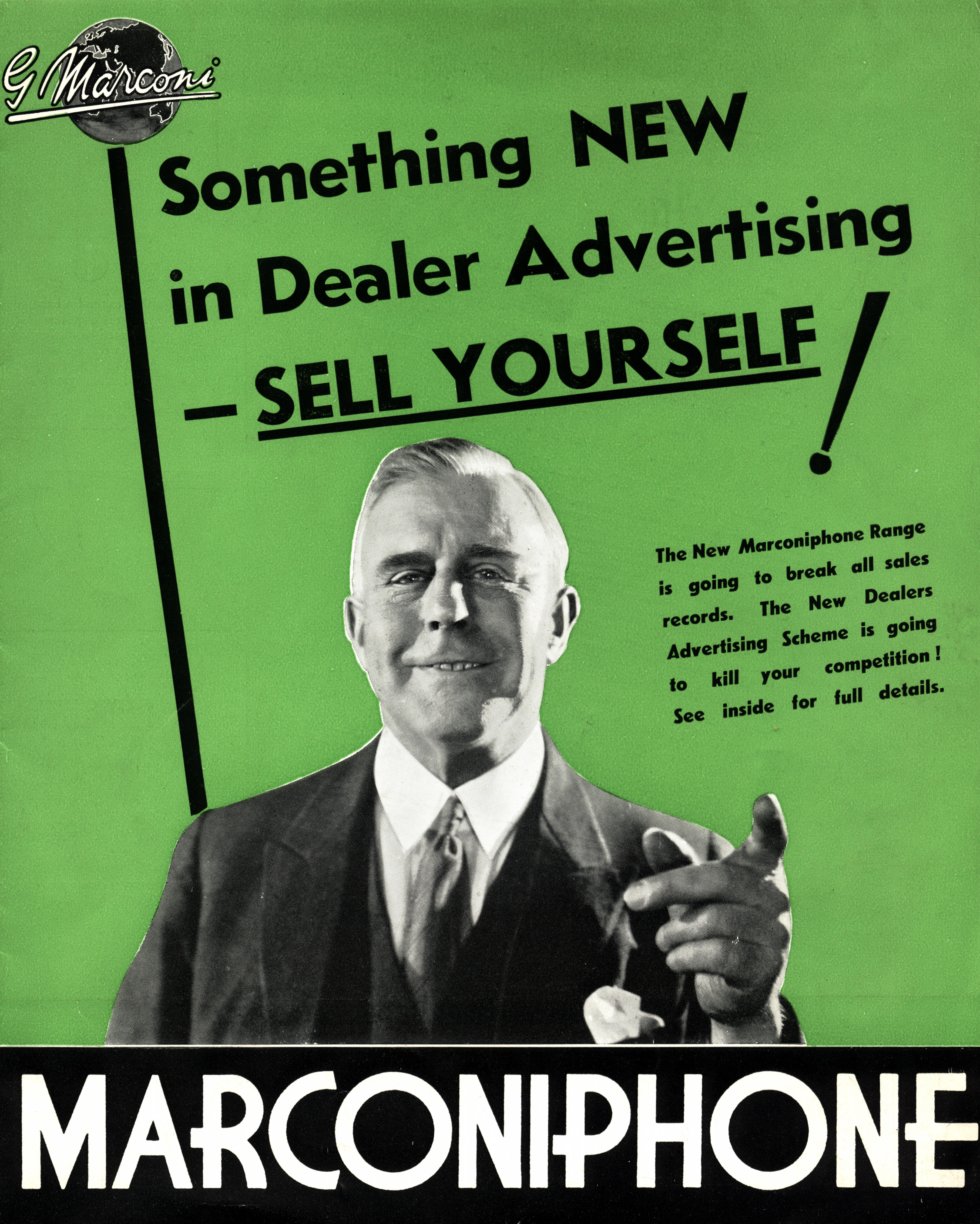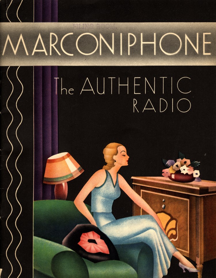 This wonderful consumer advert places the Marconiphone as a premium luxury item as is clear by the sophistication of the image and the 52 guineas price tag (about £3,000 at today’s prices):