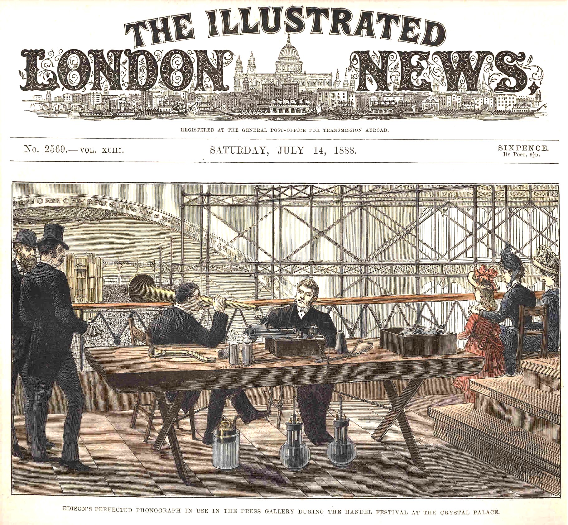 “On Friday 29th June 1888, from 2pm, a performance of Handel’s oratorio Israel in Egypt was captured on a number of wax cylinder recordings. This performance was part of the trienniel Handel Festivals mounted in the UK. They were recorded from the press gallery in Crystal Palace by Edison-representative Colonel Gouraud, as a way to test and show off Edison’s phonograph. Three of these cylinders still survive.