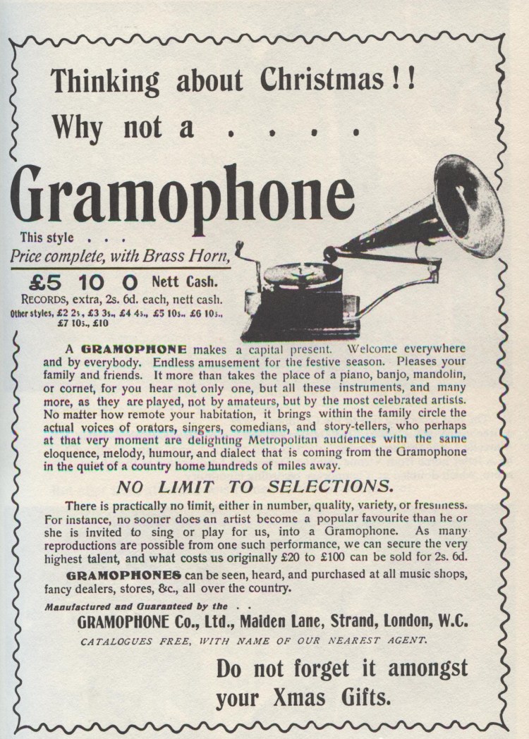 By Christmas 1899 many of the supply chain problems had been fixed and gramophones and discs were pouring into the market. Even the company’s advertising looks established. Here is an advert from that busy season: