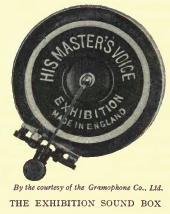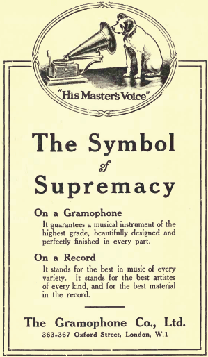 “In England at the present time there are four companies manufacturing the higher priced records. Of these The Gramophone Company, Ltd., undoubtedly holds the field. The history of this extensive concern has already been referred to cursorily in a previous chapter, but we would like to lay before the reader a more comprehensive chronicle of its origin and rise. Like most of the other large firms engaged in the industry The Gramophone Company began its career in America. As previously stated, Berliner was the man who gave the term “gramophone” to his invention of a disc machine, though he never claimed an exclusive right thereto. In 1896 or 1897 Berliner sold his English patent rights, including, it is said, his rights in respect of certain patented improvements, to a private firm calling itself The Gramophone Company, taking its name from the instrument. In 1899 this concern transferred its business to a company incorporated under the style of The Gramophone Company, Limited, the object of which, as defined by its Memorandum of Association, embraced, inter alia, the manufacture and sale of gramophones and phonographs and gramophone discs and phonograph cylinders. The last mentioned firm continued to sell machines and discs made under Berliner’s patent until the following year, when it parted with its business to a company with a larger capital. This new concern had about the same time acquired an interest in typewriters, and was incorporated as The Gramophone and Typewriter Company, Limited. The same year the Tainter-Bell patent expired, and the engraving method being considered superior to etching, the company abandoned the latter process and adopted the former, continuing, however, to use the name of gramophone. There was nothing wrong in that, for the essence of the Berliner system was the sinuous line of even depth and the word “gramophone“ had come to denote a disc talking machine, as opposed to the phonograph and graphophone which were at that time operated by cylinders.
