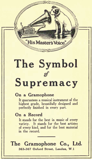 We’ve stumbled across a wonderful book called “The Talking Machine Industry” written by Ogilvie Mitchell in 1924. It is a bit of a hack job to be frank. Mr Mitchell’s style is frothy and he gallops across a range of subjects to do with the history of recorded music at that point (i.e. less than 50 years after Edison invents the phonograph). The book is one of a series of books about Common Commodities and Industries and appears to have been partly financed by adverts from the industry in question (and in return features some product placement). Long since out of print, it’s a fascinating read. We particularly enjoyed the review of the four big UK companies of the day and will reproduce a section about each of the big four over the next few days, starting now with The Gramophone Company – the predecessor company to the modern EMI.
