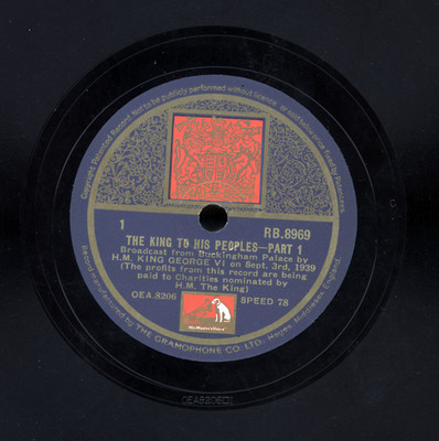 The King to his people’s Part 1 and 2. Broadcast from Buckingham Palace by H.M King George VI on September 3rd 1939 recorded exclusively with His Masters Voice Records.