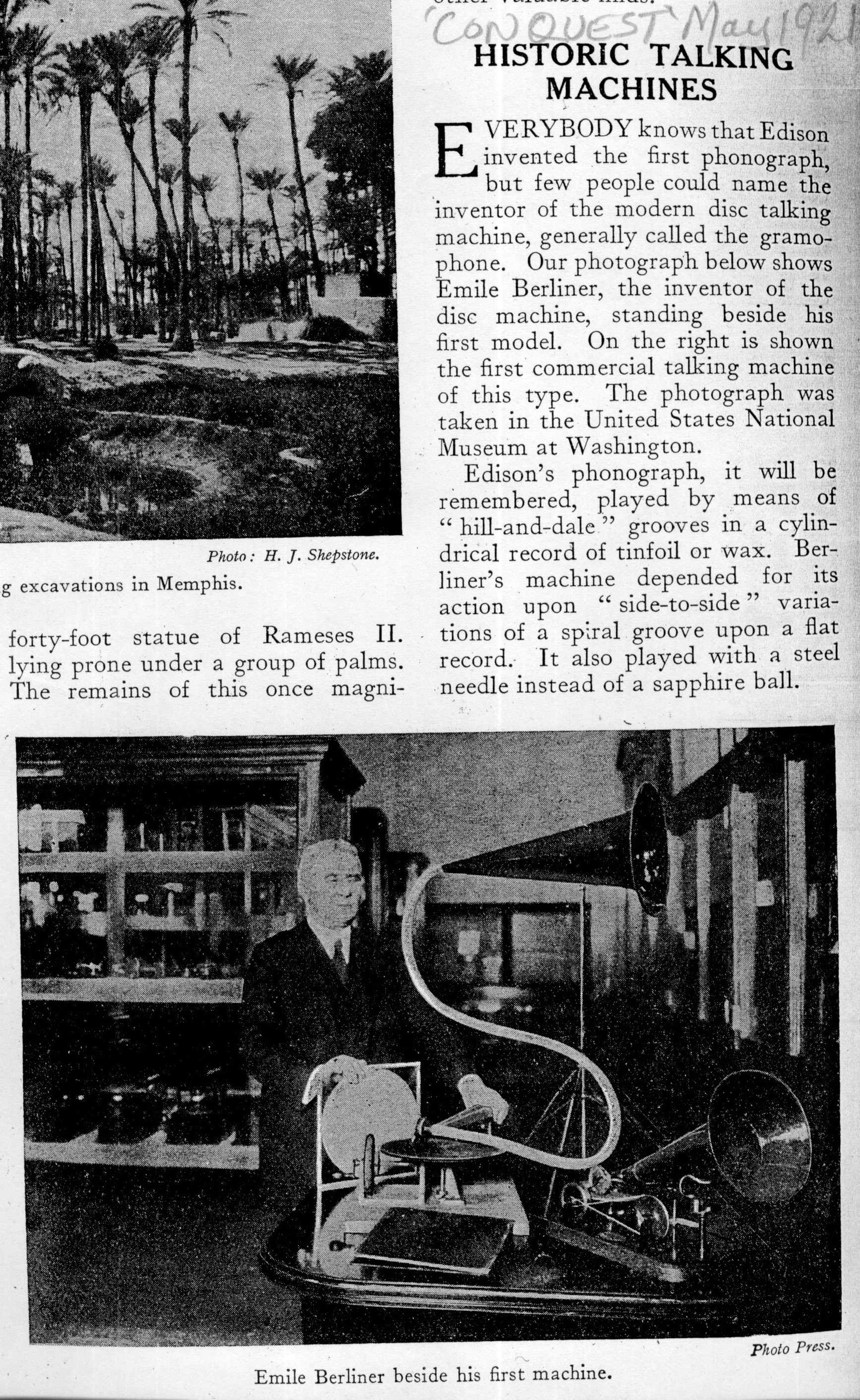 Berliner and his talking machine Posted byNipperAugust 1, 2013Posted inUncategorizedTags:1921, emile berliner, gramophone, lester smith The Hound heartily thanks Mr Lester Smith for providing this little known image of Emile Berliner standing by his first machine. Publication CONQUEST , May 1921. Share this: Click to share on Facebook (Opens in new window) Facebook Click to share on X (Opens in new window) X Like Loading... Related