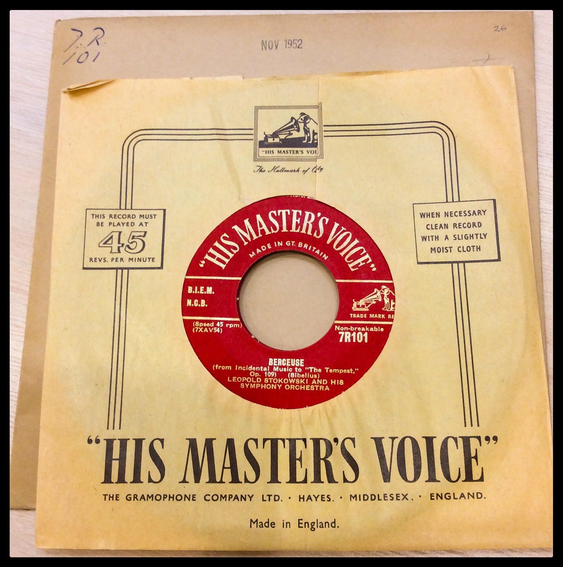 Valse Triste and Berceuse by Leopold Stokowski and his symphony orchestra, were the very first 45 singles vinyl issue on the famous red His Master’s Voice label R-100 series in November 1952.