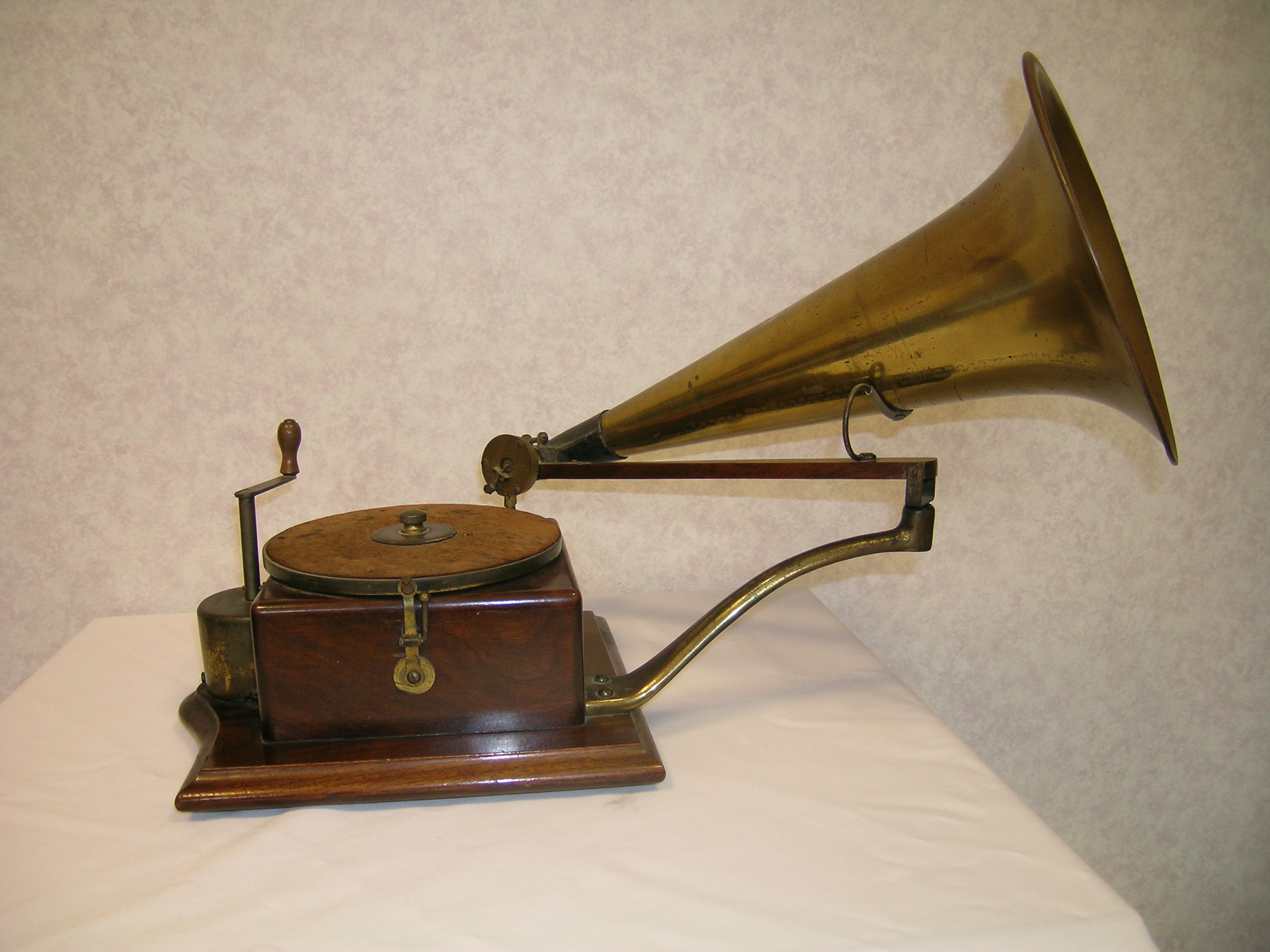 The ‘Style No.5 Gramophone’ was the first machine sold by the Gramophone Company Ltd. in 1898. It used a clockwork motor and soundbox designed by Eldridge Johnson. The wooden case is cut away at the rear to allow the semi-circular spring casing to protrude. The Style No.5 is also known as the ‘Trademark Model’ as it is the machine which Nipper is listening in the painting by Francis Barraud.