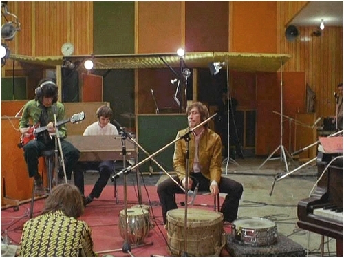 The Stones recorded several albums at Olympic studios between 1966 and 1972. Here’s the rhythm section (Watts, Wyman and Ian Stewart on keyboards) hard at it on the same Sympathy movie sessions. You can see Mick Jagger’s back in the picture. He’s wearing the same shirt as in the picture above.